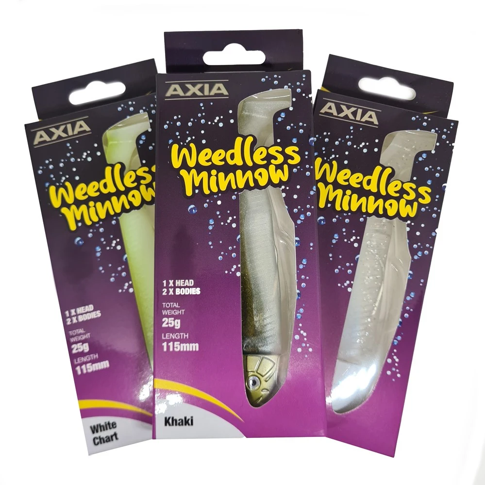 Soft plastic paddle tail minnow lures from Axia with a realistic swimming action. Arriving mounted and ready to go on a realistic jig head with a spare tail included. They are the perfect choice for working around seaweed and structure with the point of the hook masked until a fish strikes. A lure that will get attention from Bass and Pollack in saltwater and pike and zander in freshwater.