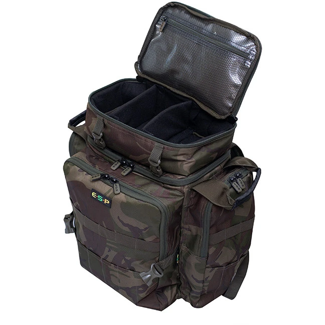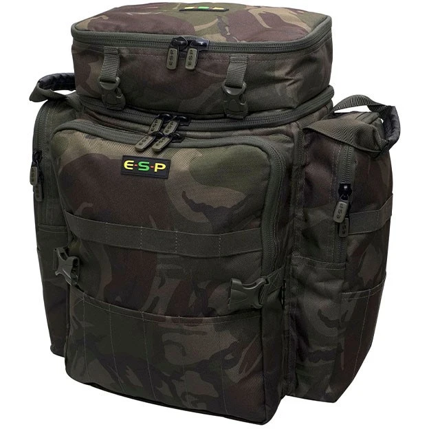 A feature-packed backpack, compatible with the matching ESP Quickdraw series of unhooking mats. Packed with features that give you an impressive amount of storage options for taking a wide array of tackle items. The main bag itself gives you 40ltrs of space, planty of room for clothing, tackle boxes and bait etc, with a zipped clear plastic pocket on the underneath of the zip off lid. On top there’s a removable tackle case, secured with four locking clips. This can be removed completely, and also features the same clear zipped plastic pocket on the reverse of the lid. Ideal for taking a selection of items like baiting tools, rig bits and essentials that you’ll need quick access to. Externally you get three generous zipped compartments with a full front and two side pockets all fitted with elasticated retaining straps and locating pockets for taking banksticks, buzzers and bankware. Plus a pair of secure locking clips on the front to take attach a quickdraw unhooking mat. Finished with a padded pair of comfy shoulder straps plus a ventilated cushioned back panel.