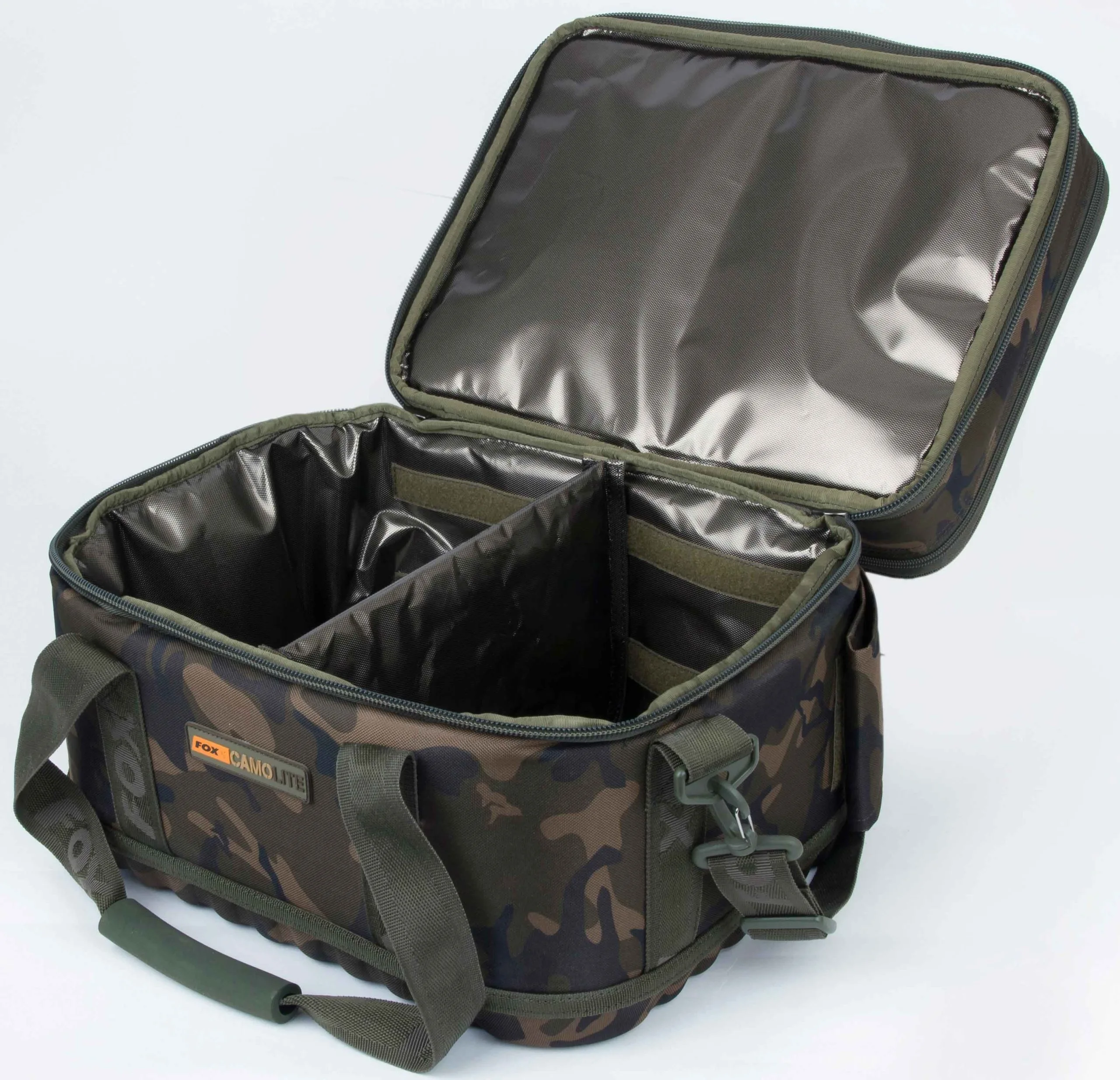 Fox Camolite Low Level Coolbag, luggage designed to be as close to the ground as possible and easily stowed underneath your bed chair to maximise your space. The main section is shielded to further insulate its contents and has a removable/adjustable divider. The top pocket is also insulated which makes it perfect for storing bait and/or food as well as keeping it fresh.