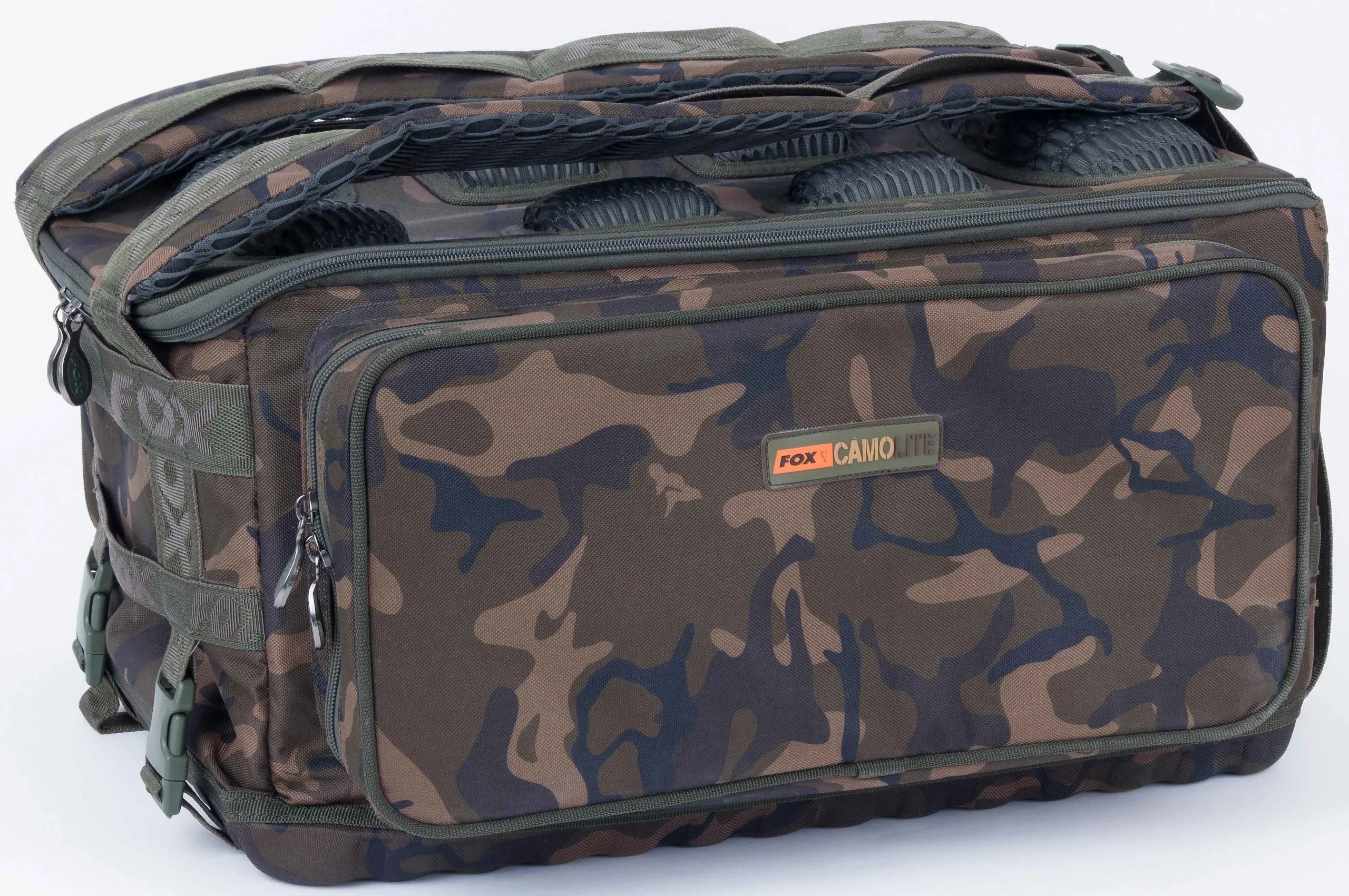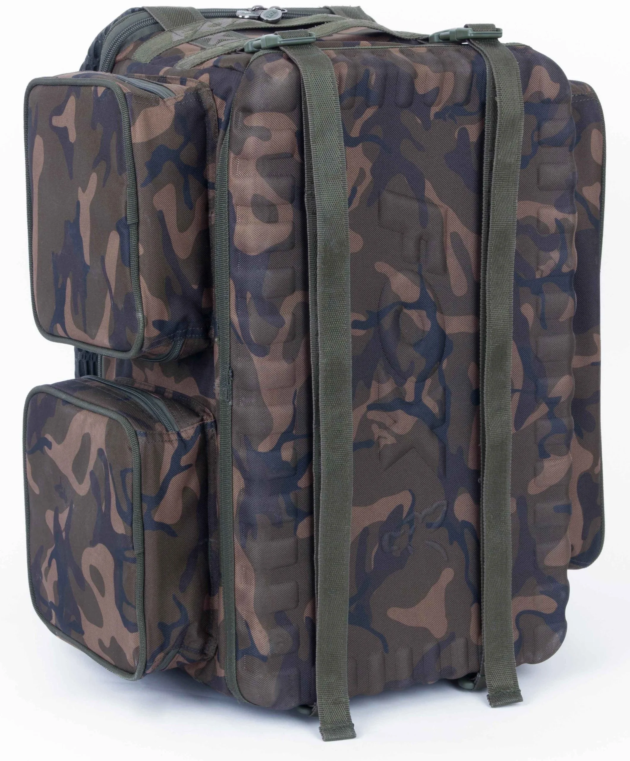 The Fox Camolite Ruckall, combining the carrying capacity of a carryall with the portability and convenience of a ruck bag. It has two detachable straps which allow a chair and/or unhooking mat to be attached for hands-free carrying. One side features a full length external storage pocket whilst the other features two smaller external storage pockets all of which are perfect for storing a variety of accessories. Fitted with a 3D non-slip shoulder straps and a padded back section which make it very comfortable to carry.
