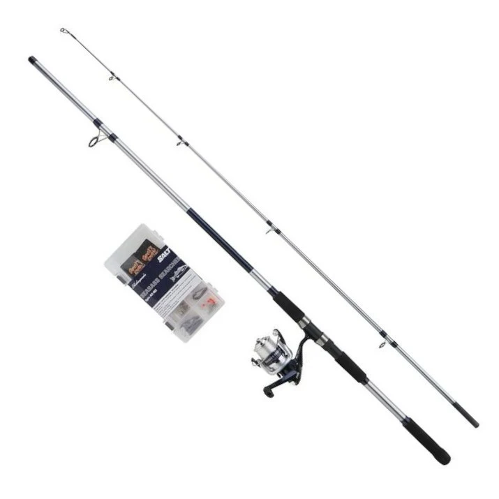 Shakespeare’s Salt seabass searcher combo set gives you everything you need to catch bass from the beach. Starting with a decent quality two piece fibreglass rod fitted with Titanium oxide guides. Plus a strong graphite fixe spool reel, pre loaded with line. You also get a plastic tackle box with everything you need to get started.